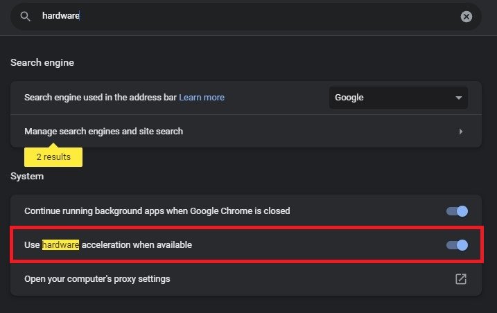 搜尋硬件加速。在下面系統,確保禁用如果可用,請使用硬件加速選項。如果您已禁用它,請確保立即啟用它,看看這是否可以解決您的 Google Chrome 啟動問題。這將使您的顯卡在系統上運行瀏覽器時能夠支持您的 CPU,並可以防止將來出現性能問題。