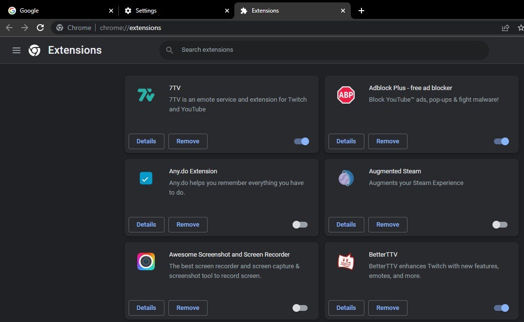 您應該從此處看到擴展列表,其中一些擴展可能會導致崩潰或啟動問題。我建議暫時禁用所有擴展程序,看看是哪個擴展程序導致了問題。您可以在使用瀏覽器時一一重新啟用它們,我只會確保您使用的擴展程序已啟用,因為任何其他未使用的擴展程序都可能會佔用您的部分網絡連接或系統性能。
