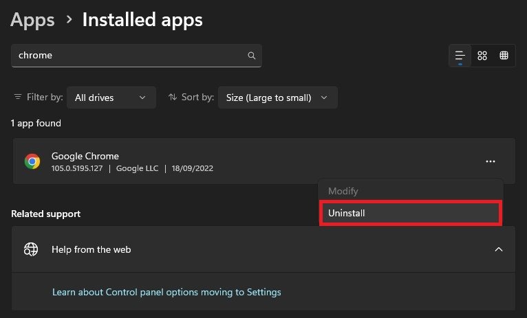 作為最後的手段,您必須在系統上重新安裝 Chrome 瀏覽器,因為某些文件可能已損壞。在 Windows 設置中,導航至應用程式部分。在下面已安裝的應用程序,搜索 Chrome。如果找不到 Google Chrome 應用程序,您可能必須按所有驅動器過濾搜索。