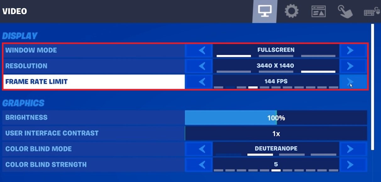 Fortnite 設置 > 視頻 > 顯示