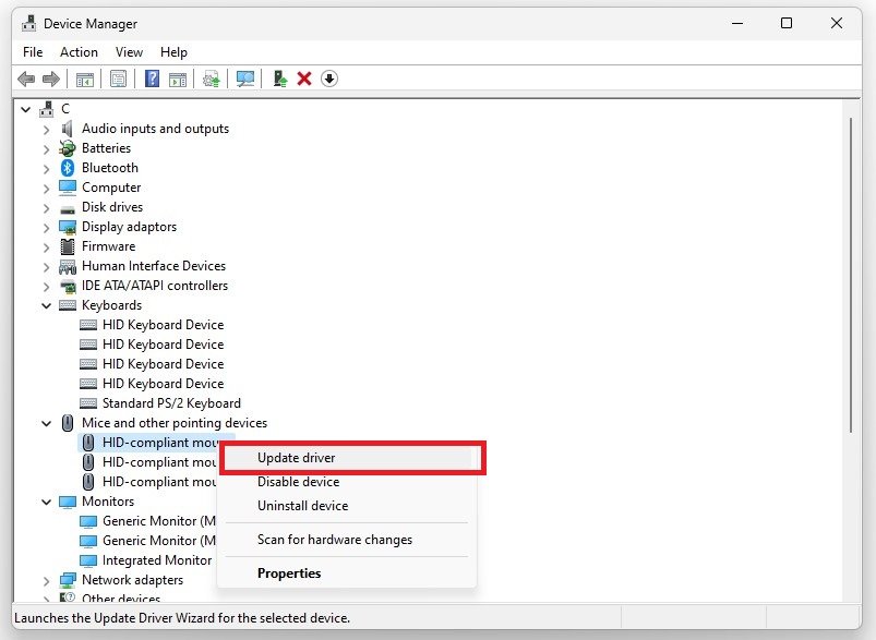 設備管理器 > 鼠標和其他指點設備 > 更新驅動程序