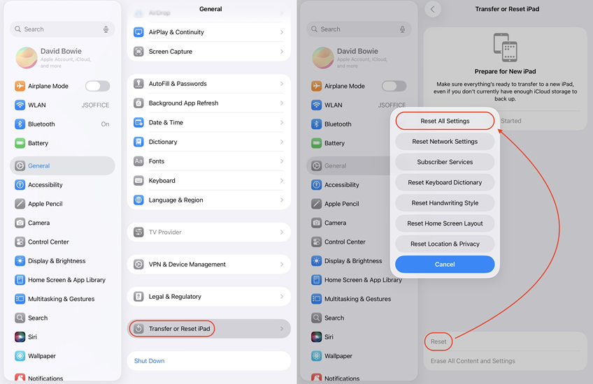 步驟2。輕敲重置 > 重置所有設置將您的 iPad 設置恢復為原始狀態。
