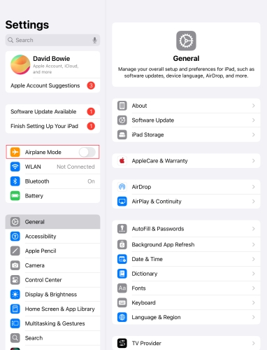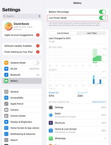 您可以打開低電量模式、飛行模式和請勿打擾等設置,以直接有效地節省 iPad 電池。這些設置將減少後台活動並防止通知推送消耗 iPad 電池。