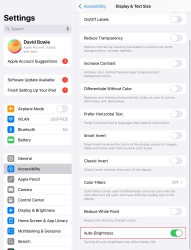 運動效果和高亮度會消耗 iPad 的電池電量來呈現最佳視覺效果。 “輔助功能”下的某些設置(例如“減少動作”和“自動亮度”)可以幫助您節省 iPad 電池。