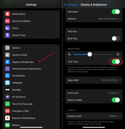 關閉 iPhone 上的 Night Shift 後,如果屏幕仍呈黃色,則可以檢查 True Tone 選項。在支持的型號、True Tone 會自動調整顯示屏的顏色和強度,以匹配您環境中的光線。您可以在此處調整原彩選項來更改屏幕顯示。
