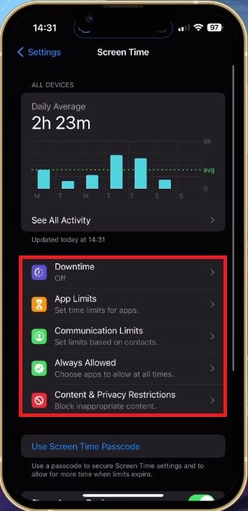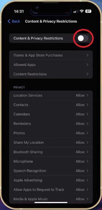 最近對 iPhone 設置的任何更改(例如限制後台數據或家長控制設置)都可能會阻止應用程序正常啟動。點擊主要設置中的屏幕時間。在這裡,選擇內容和隱私限制。確保禁用所有當前啟用的限制。