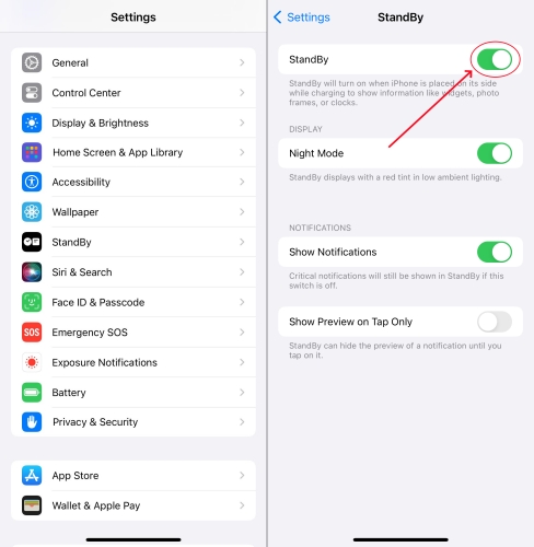 如果紅屏是由蘋果功能引起的,這是完全正常的。一個常見的原因是夜間模式下的待機模式,該模式會在 iPhone 橫向充電時激活。 StandBy 可將您的 iPhone 轉變為床頭時鐘、相框或小部件和實時活動顯示屏。啟用夜間模式後,它會將屏幕調整為紅色,以降低弱光條件下的亮度,使您在睡眠時更舒適。這就是為什麼有些用戶在 iPhone 鎖屏上看到紅色時鐘的原因。其他功能(例如“輔助功能”設置中的“濾色鏡”或“夜班”)也可以更改屏幕的顏色。
