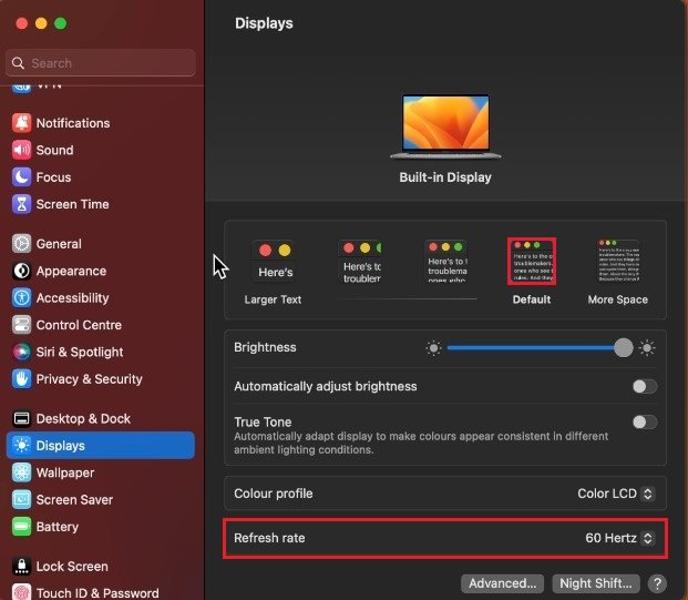 對於 Mac OS Ventura 及更高版本,導航至顯示器部分。這將允許您為 MacBook Air 和 MacBook Pro 用戶預覽連接的外部顯示器和/或內置筆記本電腦屏幕。在這裡,您首先可以通過在這些設置之間切換來更改顯示分辨率。默認選項應該效果最好,因為它將使用本機顯示分辨率。