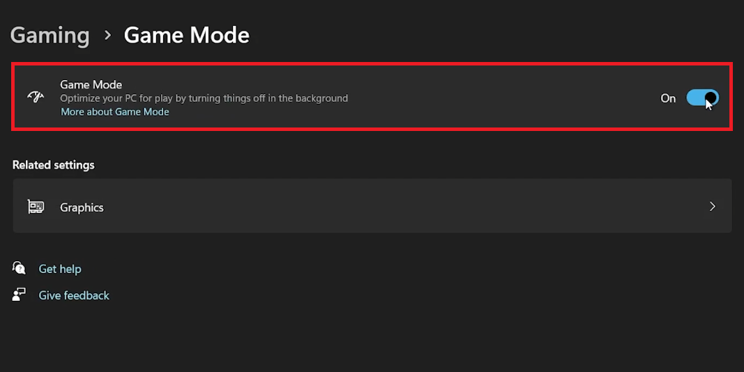 激活遊戲模式:打開遊戲模式。此功能根據系統資源優先考慮遊戲,確保更好的性能,特別是在規格較低的系統上。