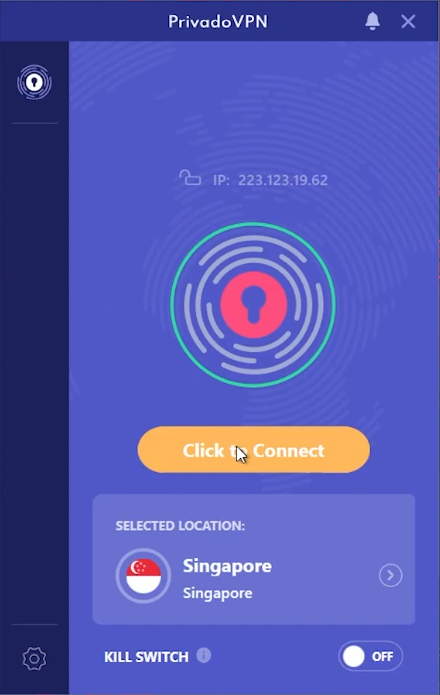 登錄並連接:打開 PrivadoVPN,登錄並點擊“單擊連接”按鈕即可立即連接到您所在地區的最佳服務器。