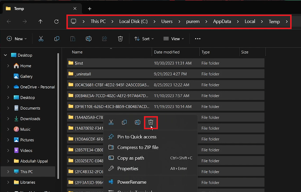 刪除不需要的文件:這將打開存儲臨時文件的文件夾。安全刪除此處的大多數文件以釋放空間。