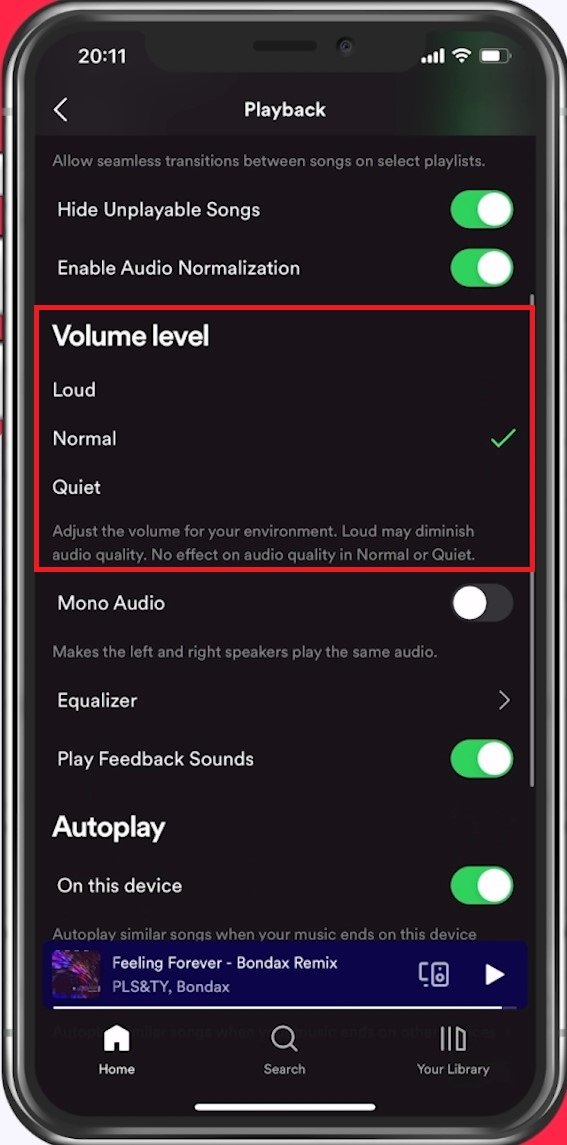 如果您使用同一帳戶的另一台設備在 Spotify 上收聽音樂,此選項可能會呈灰色。在你的回放設置,您可以選擇設置整體音量級別到安靜的,普通的或者大聲。應設置為普通的默認情況下,但大聲可能最適合您,具體取決於您使用的音頻輸出設備。