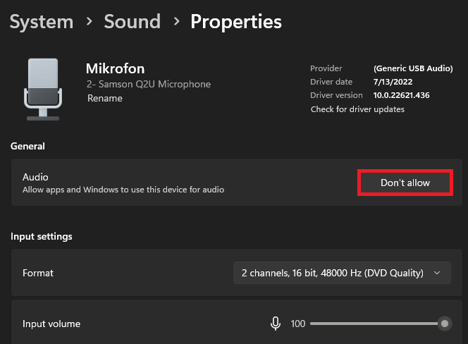 為避免連接多個麥克風時發生衝突,請導航至 Windows 設置中的“聲音”。在這裡,選擇任何輔助音頻輸入設備,然後選擇“不允許”選項暫時禁用它們,以防止遊戲過程中出現任何衝突。