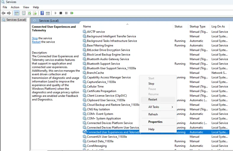 Microsoft 遙測服務可能遇到技術問題,導致 CPU 使用率異常高。在這些情況下,重新啟動遙測服務可能會很有幫助。