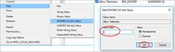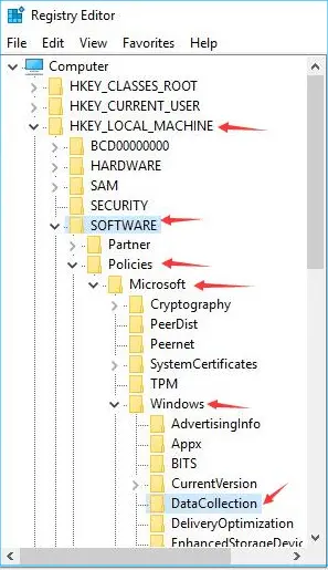HKEY_LOCAL_MACHINE > 軟件 > 策略 > Microsoft > Windows > DataCollection