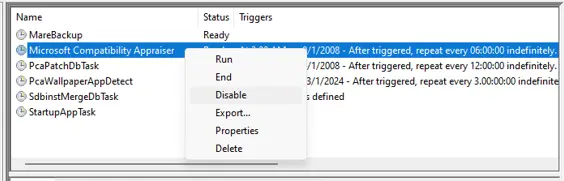 3. 在中央面板中,查找 Microsoft Compatibility Appraiser,然後右鍵單擊它以選擇“禁用”。
