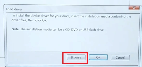 10. 導航至可啟動 USB 驅動器上的 Intel VMD 驅動程序文件夾,然後單擊“確定”。