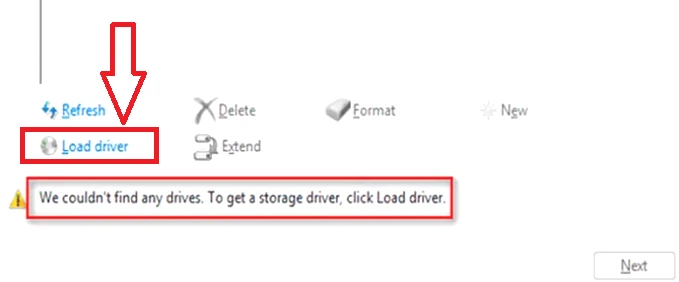 8. 按照安裝說明進行操作。當顯示“我們找不到任何驅動器”錯誤時,單擊“加載驅動程序”選項。