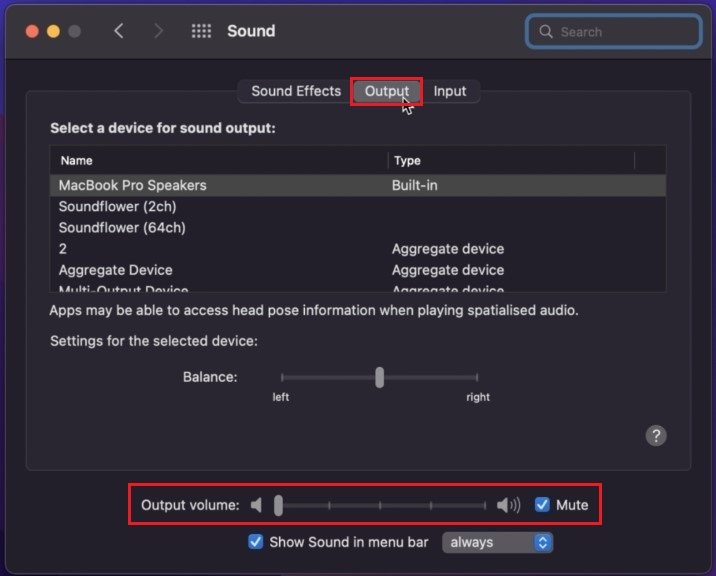 在聲音設置中,確保您處於輸出部分,從這裡,您可以選擇正確的輸出設備。這可能是您的內置揚聲器或外部聲音設備,例如耳機或藍牙揚聲器。您還可以在下面更改輸出音量,並通過取消選中來確保您的設備沒有靜音沉默的複選框。