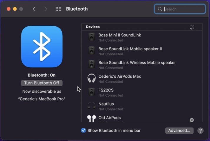 如果您嘗試收聽藍牙設備,請返回主設置並單擊藍牙。從這裡,您可以打開藍牙並確保您的揚聲器已配對。