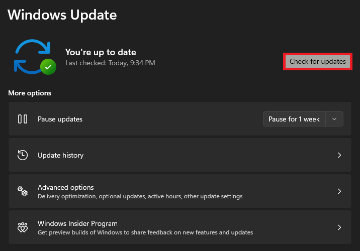 要使您的 Windows 操作系統保持最新狀態,請轉到“Windows 設置”,選擇“Windows 更新”部分,然後單擊“檢查更新”以下載並安裝任何可用更新。