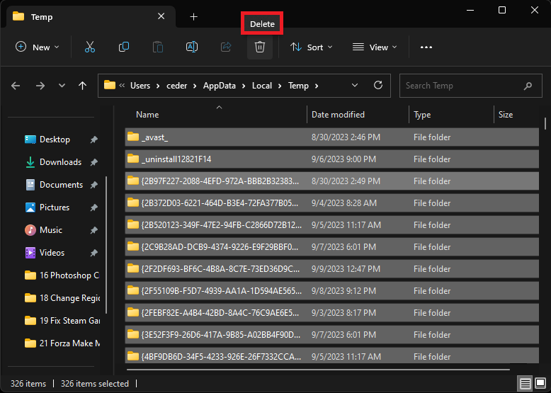 清理:選擇該文件夾中的所有文件(Ctrl+A)並刪除。如果某些文件仍然存在,請不要擔心,它們可以保持不變。