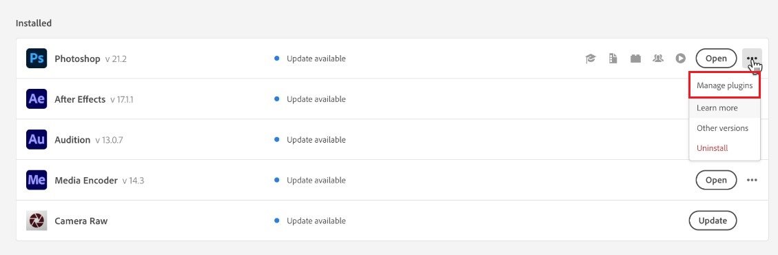 Creative Cloud > 已安裝的應用程序 > 管理插件