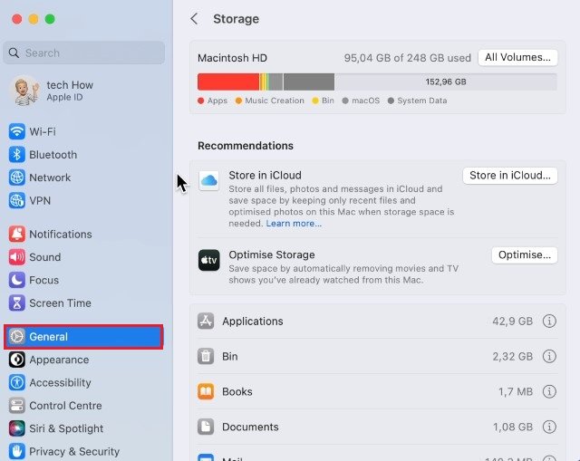 確保您的 Photoshop 應用程序是最新的後,打開您的系統設置。在一般的部分,單擊貯存。確保您有最少的剩餘存儲空間來保存 Photoshop 文件。如果可用空間不足,請按照存儲建議進行操作,清空垃圾箱或刪除下載文件夾的內容,然後再繼續。