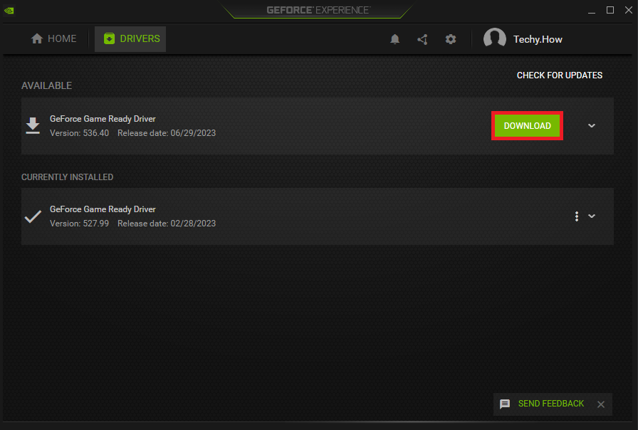 如果您是 GeForce 用戶,請使用 GeForce Experience 應用程序。導航至“驅動程序”部分並下載最新更新(如果有)。