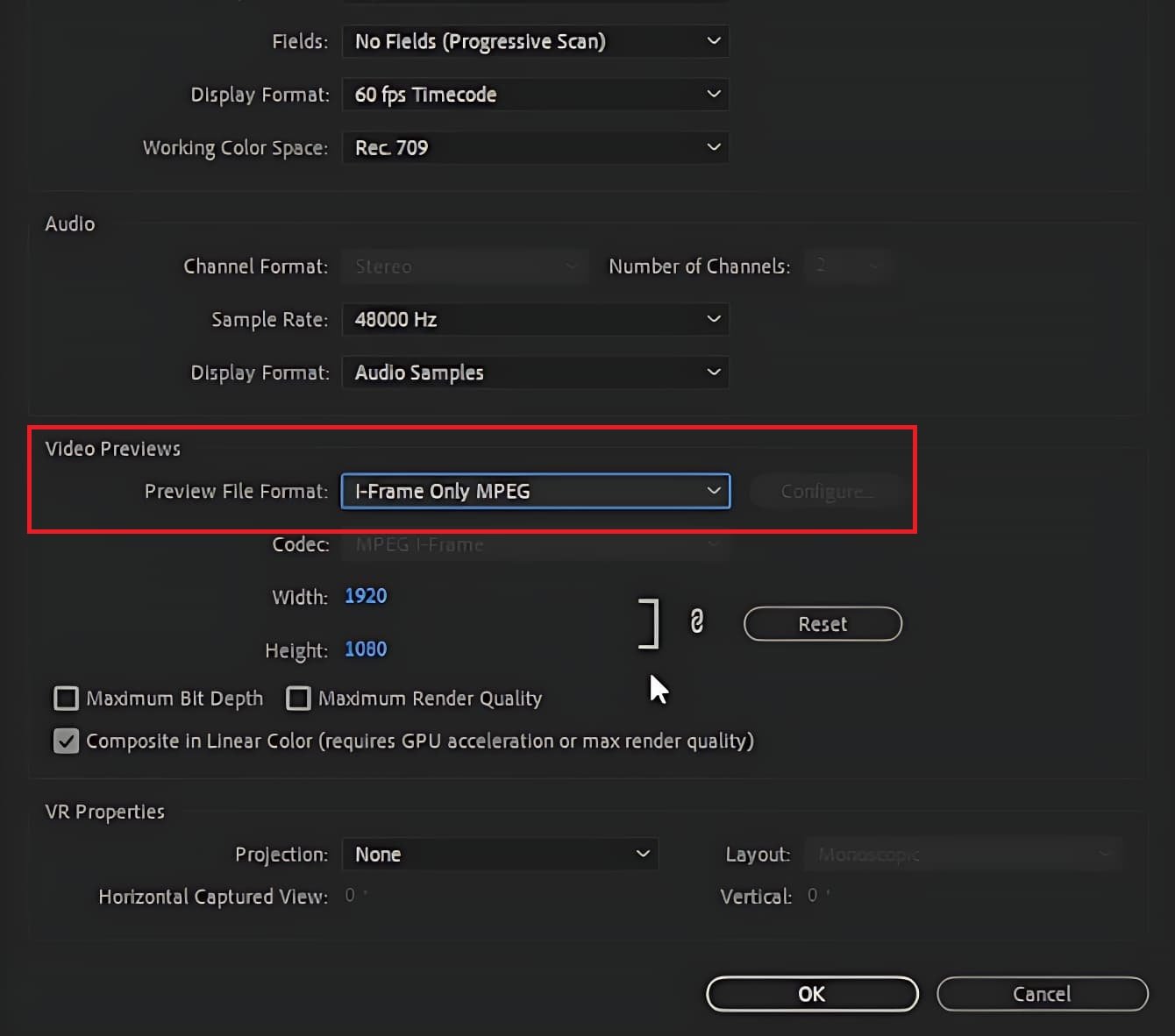 首先調整“序列設置”下的“預覽文件格式”。將其從“Microsoft AVI”切換為推薦選項。