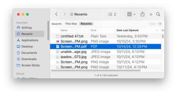 從技術上講,“最近”是一個“智能文件夾”,這基本上意味著它是一個附加了搜索參數的文件夾,因此它將顯示與這些搜索參數匹配的所有文件。在“最近”的情況下,智能文件夾正在查找顯示文件上次打開時間的文件數據,並按該信息顯示和排序。因此,“最近”的工作原理是按照上次在 Mac 上打開的時間順序顯示任何/所有文件。
