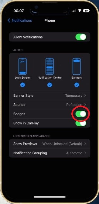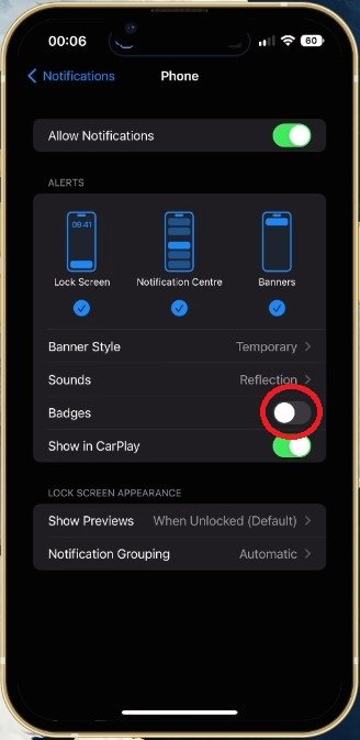 最後,回到你的通知設定.在下面電話,您可以重新啟用徽章選項,這將刪除紅點並修復 iOS 設備上的通知錯誤。