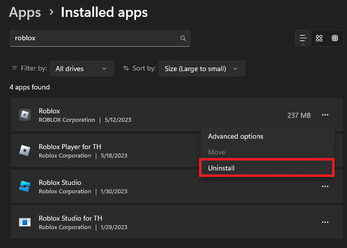 Windows 設置 > 應用程序 > 已安裝的應用程序 > Roblox > 卸載
