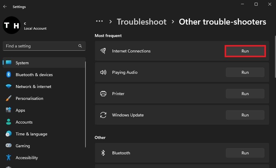 如果問題仍然存在,請返回 Windows 設置。在系統部分,向下滾動並單擊故障排除。在下面其他疑難解答,運行互聯網連接疑難解答。確定並解決互聯網連接的常見問題需要幾秒鐘的時間,並且可能會應用一些網絡和互聯網設置來改善您的連接。
