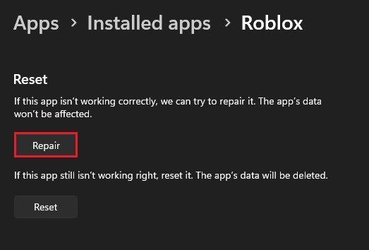 在此窗口中,向下滾動並單擊維修。這需要一些時間來確保您的 Roblox 應用程序正常工作。