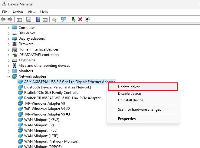 在此窗口中,展開您的網絡適配器。右鍵單擊您正在使用的並選擇更新驅動程序。在此窗口中,選擇自動搜索驅動程序。如果不確定您使用的是哪個網絡適配器,請對此設備列表中的每個設備重複此步驟。