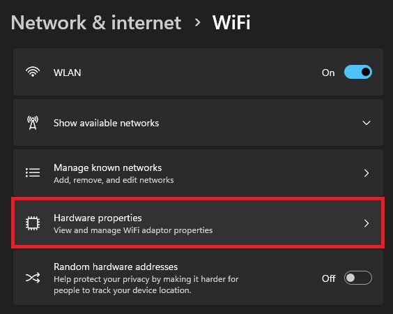 Windows設置>網絡和Internet> Wifi>硬件屬性