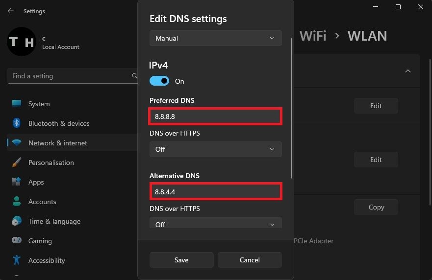 編輯您的DNS設置,並在IPv4下設置您的設置首選DNS服務器地址8.8.8.8和替代DNS地址8.8.4.4。這些是Google的官方DNS服務器地址,可以安全使用,並將修復嘗試加入Roblox服務器時要獲得的錯誤代碼400。