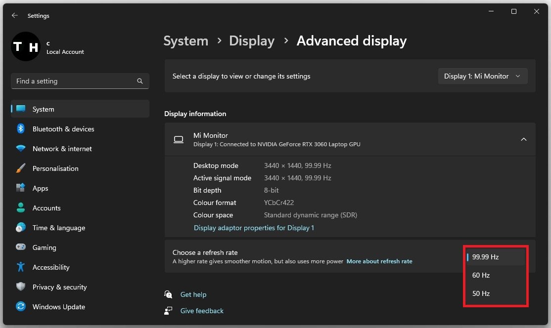在你的高級顯示設置中,您還應該確保選擇最高的可用刷新率。