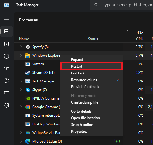 如果問題仍然存在,您需要重新啟動“Windows 資源管理器”進程並重新啟動計算機。打開任務管理器,然後在進程部分下找到 Windows 資源管理器進程。右鍵單擊它並選擇“重新啟動”以刷新該過程。