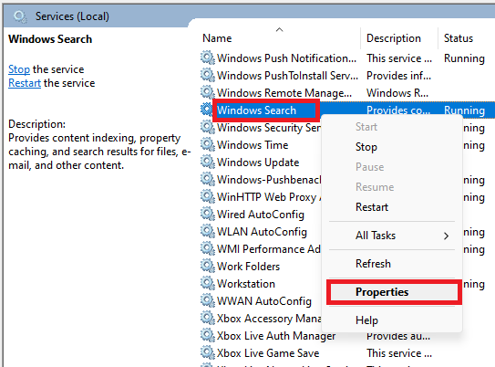 要訪問 Windows 服務管理器,請在“開始”菜單中鍵入“服務”。如果找不到它,請搜索 Services.msc。在窗口中,單擊任何服務並開始鍵入“Windows Search”以找到“Windows Search”服務。右鍵單擊該服務可查看其屬性。
