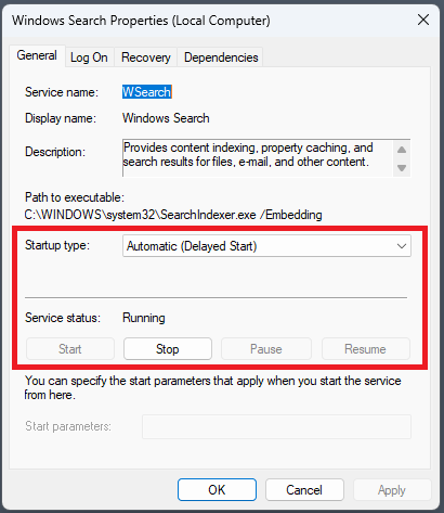 在“常規”部分中,確認該服務的啟動類型設置為“自動”。服務狀態應表明它正在運行;如果沒有,請單擊“開始”並應用更改。