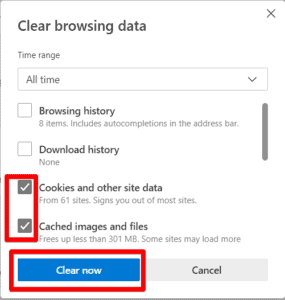 - 選擇 ”清除時間範圍“ 和 ”一切”。