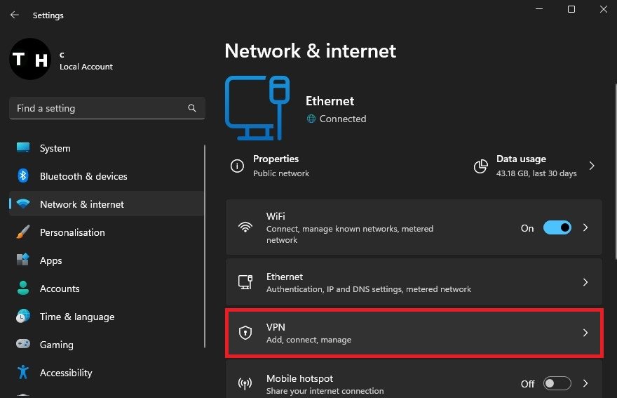阻止應用程序使用您的網絡帶寬後,打開 Windows 設置。導航至網絡與互聯網部分並單擊VPN。在對互聯網連接速度較慢進行故障排除時,請阻止任何 VPN 或代理連接,因為啟用 VPN 後可能會導致速度變慢和延遲增加。