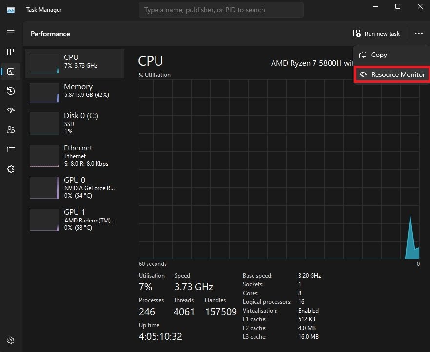 首先,打開你的工作管理員。右鍵單擊任務欄並選擇工作管理員,或在開始菜單搜索中搜索它。在此窗口中,導航至表現部分。在 Windows 11 上,單擊此漢堡菜單圖標並選擇資源監控器。在 Windows 10 上,您將看到打開資源監視器該窗口底部的選項。