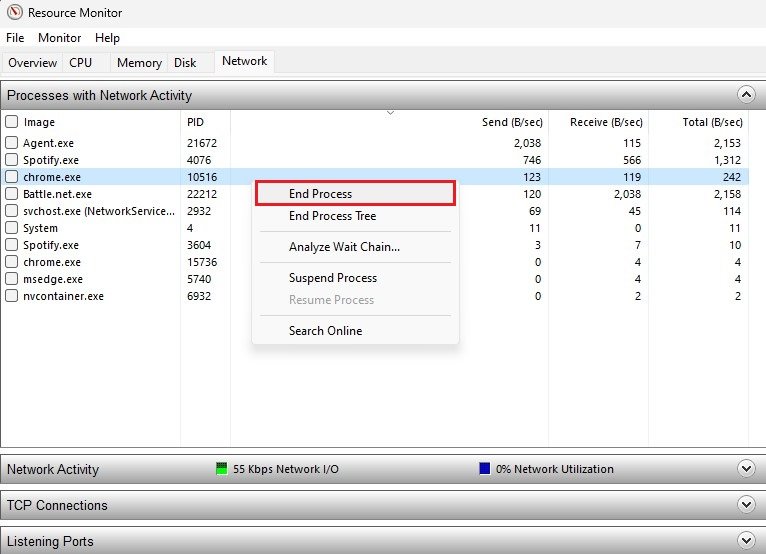 導航至網絡部分並展開具有網絡活動的進程。這將允許您預覽當前使用互聯網連接的所有進程。帶寬要求較高的應用程序包括 Google Chrome 瀏覽器、Steam 等遊戲啟動器或其他允許您下載內容的應用程序(例如 Spotify)。