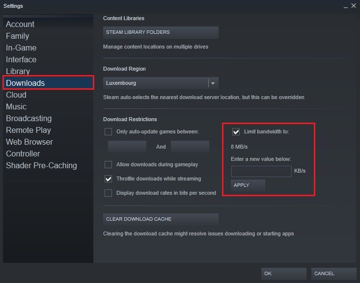為了防止這種情況發生,請打開相關應用程序,在本例中為“Steam”。導航至應用程序設置。在下載部分,將下載帶寬限制為下載速度的三分之一左右。這也取決於您的電腦存儲的寫入速度。應用帶寬限制,在本例中為 8MB/s。