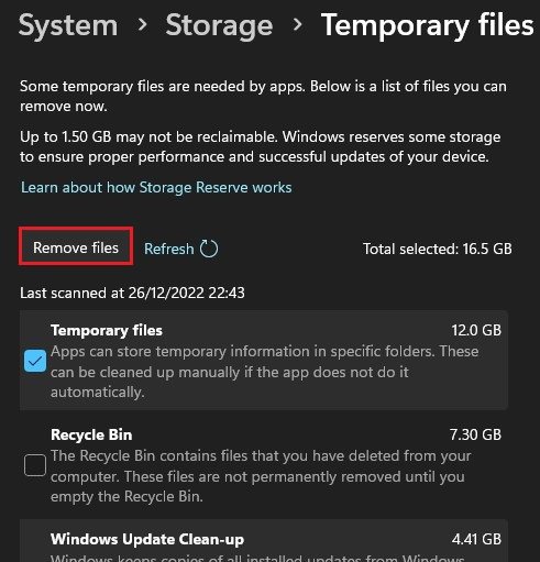 打開您的 Windows 設置。在下面系統,點擊貯存。加載您的存儲信息並選擇可能需要幾秒鐘的時間臨時文件。確保選擇“臨時文件”選項以及您可能想要刪除的其他文件,以清理硬盤並防止不必要的加載。這將包括回收站、Windows 更新文件和我的下載文件夾的內容。