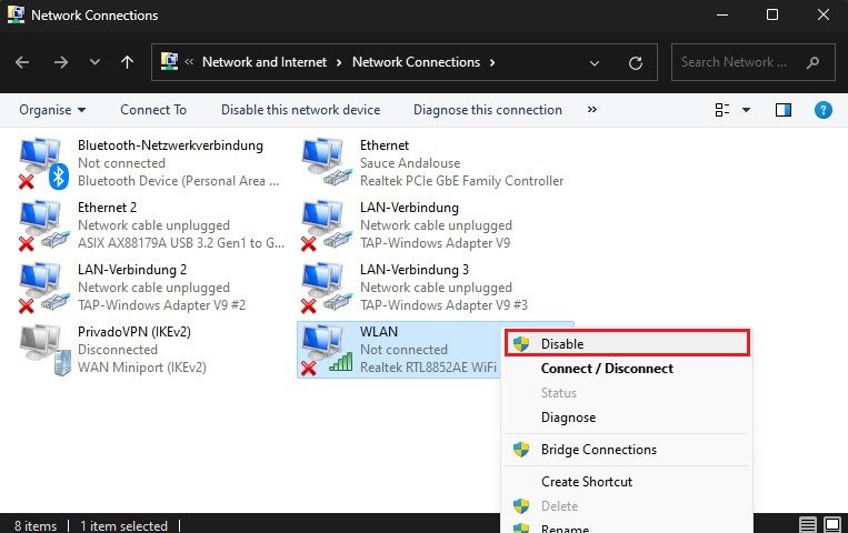 導航到您的網絡與共享中心,然後單擊更改適配器設置。最後,右鍵單擊您的活動網絡連接並選擇禁用。等待幾秒鐘後,再次右鍵單擊該連接並選擇使能夠。