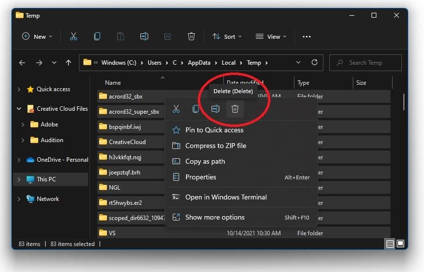 您的硬盤驅動器可能塞滿了不需要的文件。如果未正確刪除,這些文件將導致延遲。您可以手動刪除臨時文件或使用 PC 清理程序,例如 CCleaner。這些應用程序通常是最佳選擇,因為它們會自動保持硬盤驅動器清潔。要手動刪除臨時文件,請輸入%溫度%在任務欄中搜索並按 Enter 鍵。將打開一個新文件夾。確保刪除臨時文件夾的內容。